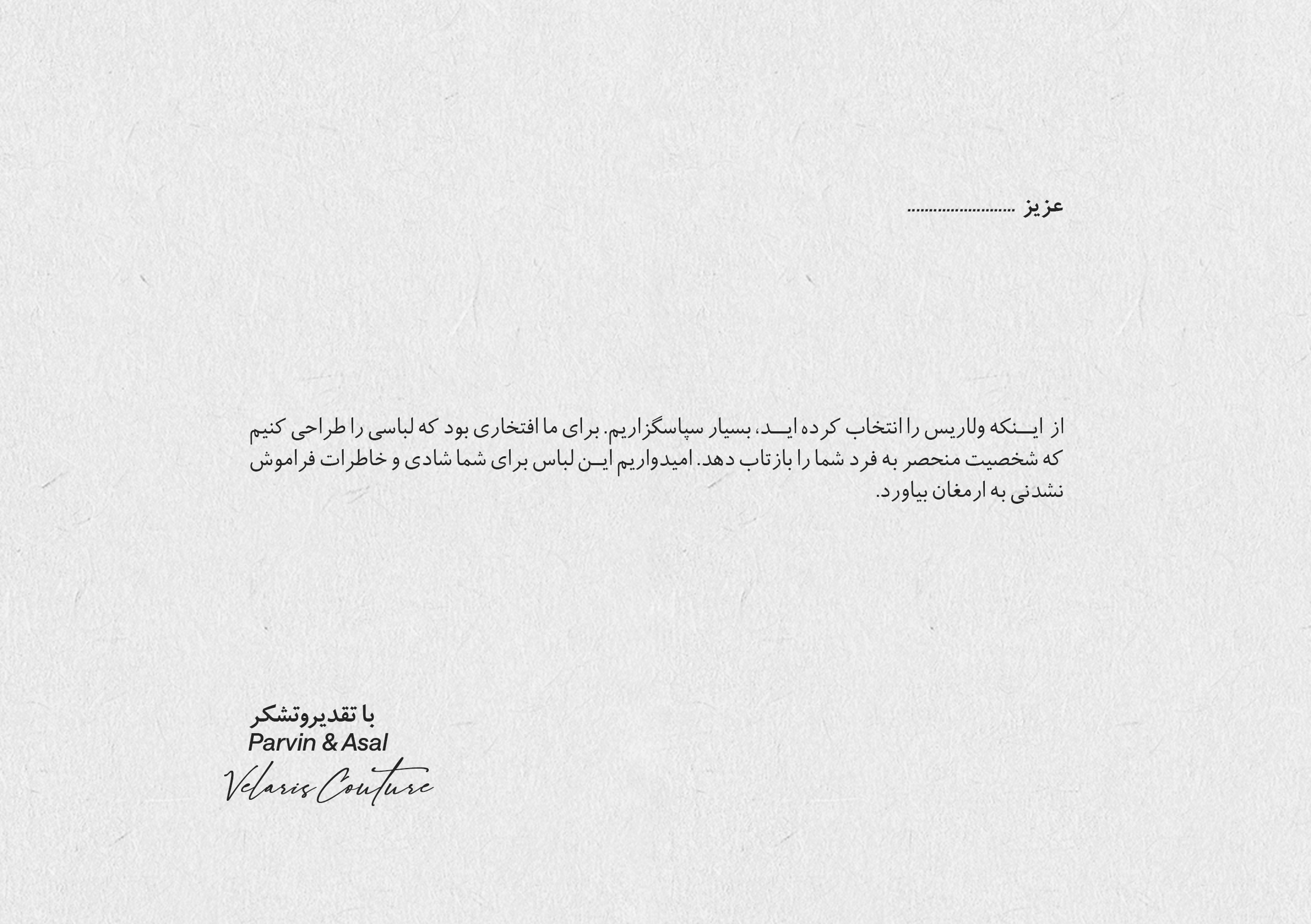 ما به کیفیت ، جزئیات و انتخاب پارچه اهمیت میدهیم و باور داریم هر لباس باید داستانی از ظرافت ، قدرت و شخصیت زنانه را روایت کند.